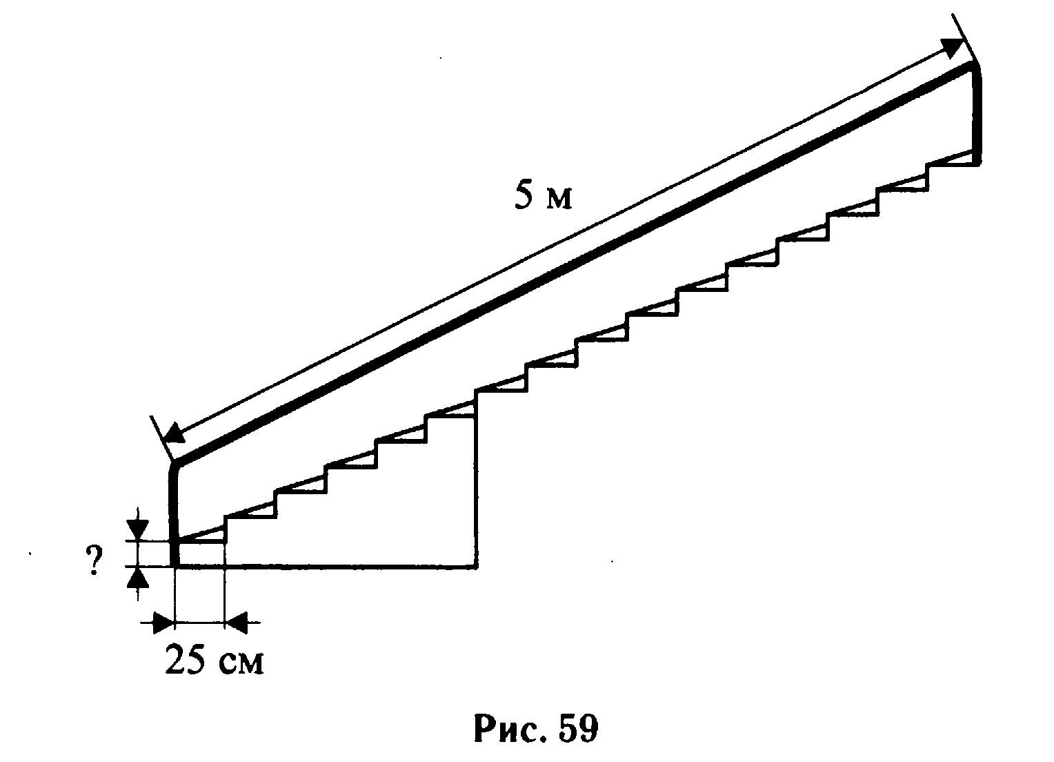 Лестница состоит из 16 ступенек, шириной 25 см каждая (см. рис. 59). Найдите высоту каждой ступеньки (в см), если длина перил 5 м.