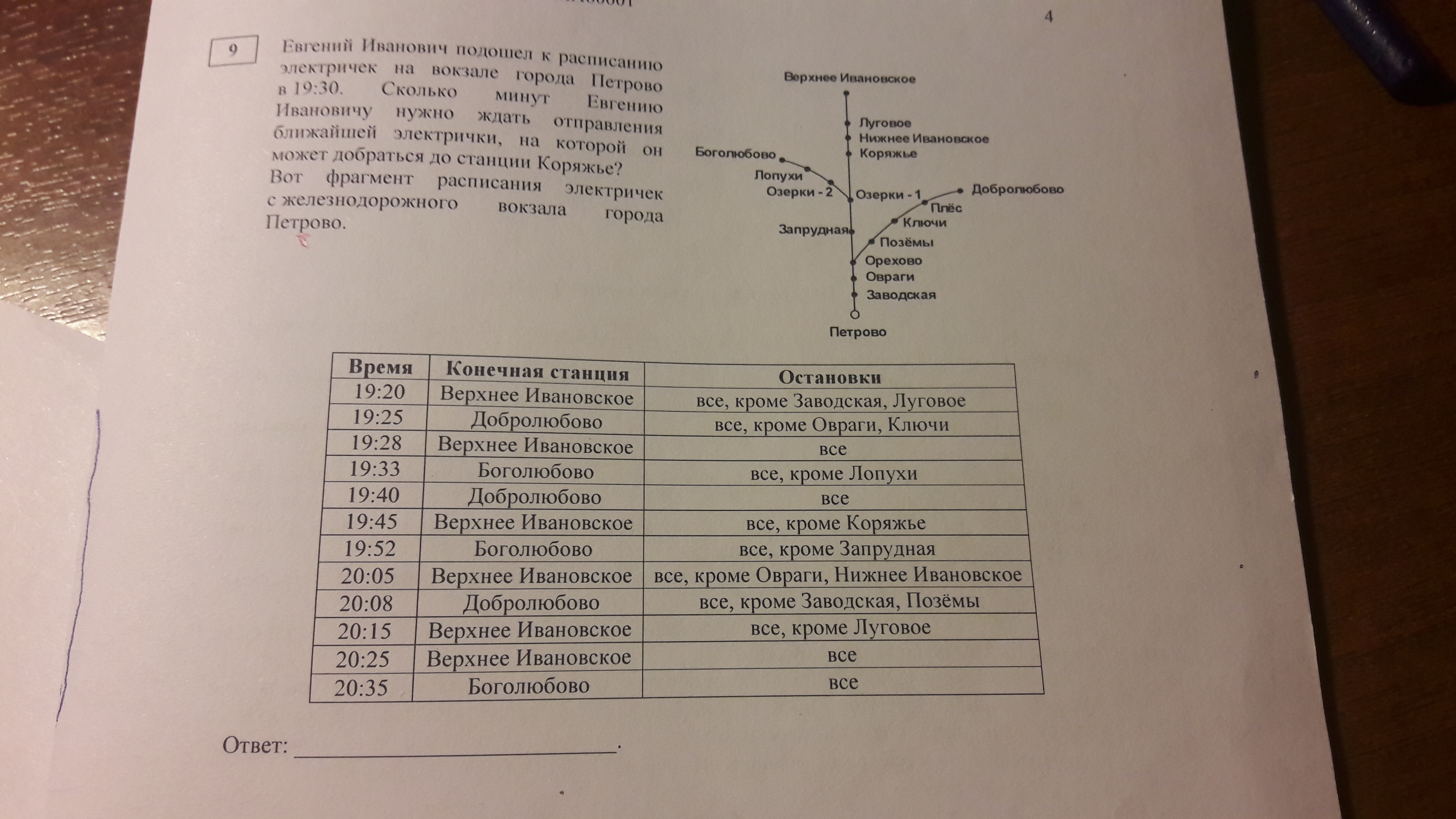 чтобы добраться до станции Коряжье,нужно сесть на электричку,у которой конечная станция - Верхнее Ивановское. Таких электричек несколько. Электрички,которые идут в 19:20 и 19:28 не подходят,т.к. Евгений Иванович подошел к расписанию в 19:30 (эти электрички уже ушли). Следующая электричка до Верхнее Ивановское в 19:45,но она не подходит (в расписании написано - кроме Коряжье,значит там она не останавливается).