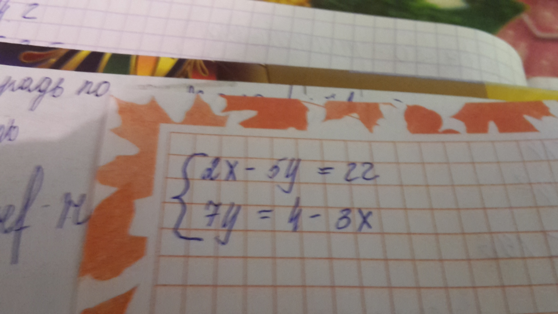 {2x - 5y = 22, 7y = 4 - 3x; {x - 2,5y = 11, 7y + 3x = 4; {x = 11 + 2,5y, 7y + 3x = 4; | 7y + 3 (11 + 2,5y) = 4; 7y + 33 + 7,5y = 4; 14,5y = 4 - 33; 14,5y = - 29; y = - 2| {y = -2, x = 11 + 2,5 * (-2); {y = -2, x = 6. Ответ: (6; -2).