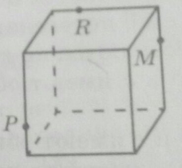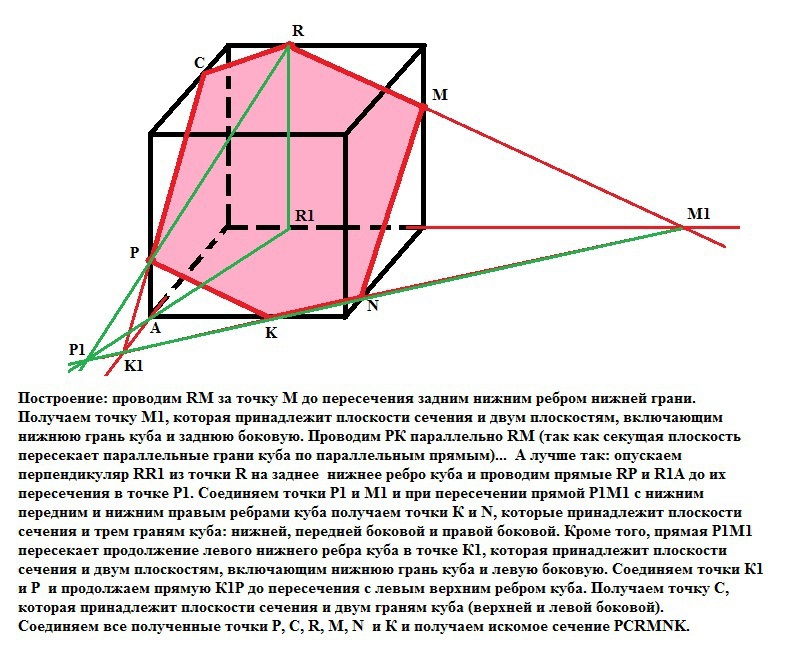 Построение: проводим RM за точку М до пересечения задним нижним ребром нижней грани. Получаем точку М1, которая принадлежит плоскости сечения и двум плоскостям, включающим нижнюю грань куба и заднюю боковую. Проводим РК параллельно RM (так как секущая плоскость пересекает параллельные грани куба по параллельным прямым)... А лучше так: опускаем перпендикуляр RR1 из точки R на заднее нижнее ребро куба и проводим прямые RP и R1A до их пересечения в точке Р1. Cоединяем точки Р1 и М1 и при пересечении прямой Р1М1 с нижним передним и нижним правым ребрами куба получаем точки К и N, которые принадлежит плоскости сечения и трем граням куба: нижней, передней боковой и правой боковой. Кроме того, прямая Р1М1 пересекает продолжение левого нижнего ребра куба в точке К1, которая принадлежит плоскости сечения и двум плоскостям, включающим нижнюю грань куба и левую боковую. Соединяем точки К1 и Р и продолжаем прямую К1Р до пересечения с левым верхним ребром куба. Получаем точку С, которая принадлежит плоскости сечения и двум граням куба (верхней и левой боковой).