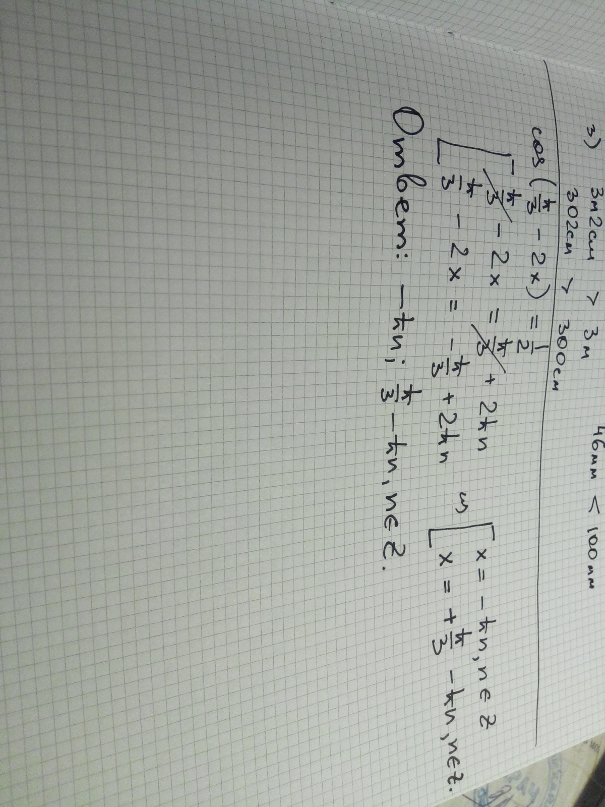 Ответ 2 (π/3)-2*x=(5*π/3)+2*π*n⇒2*x=(π/3)-(5*π/3)-2*π*n⇒2*x=(-4*π/3)-2*π*n⇒x=(-2*π/3)-π*n