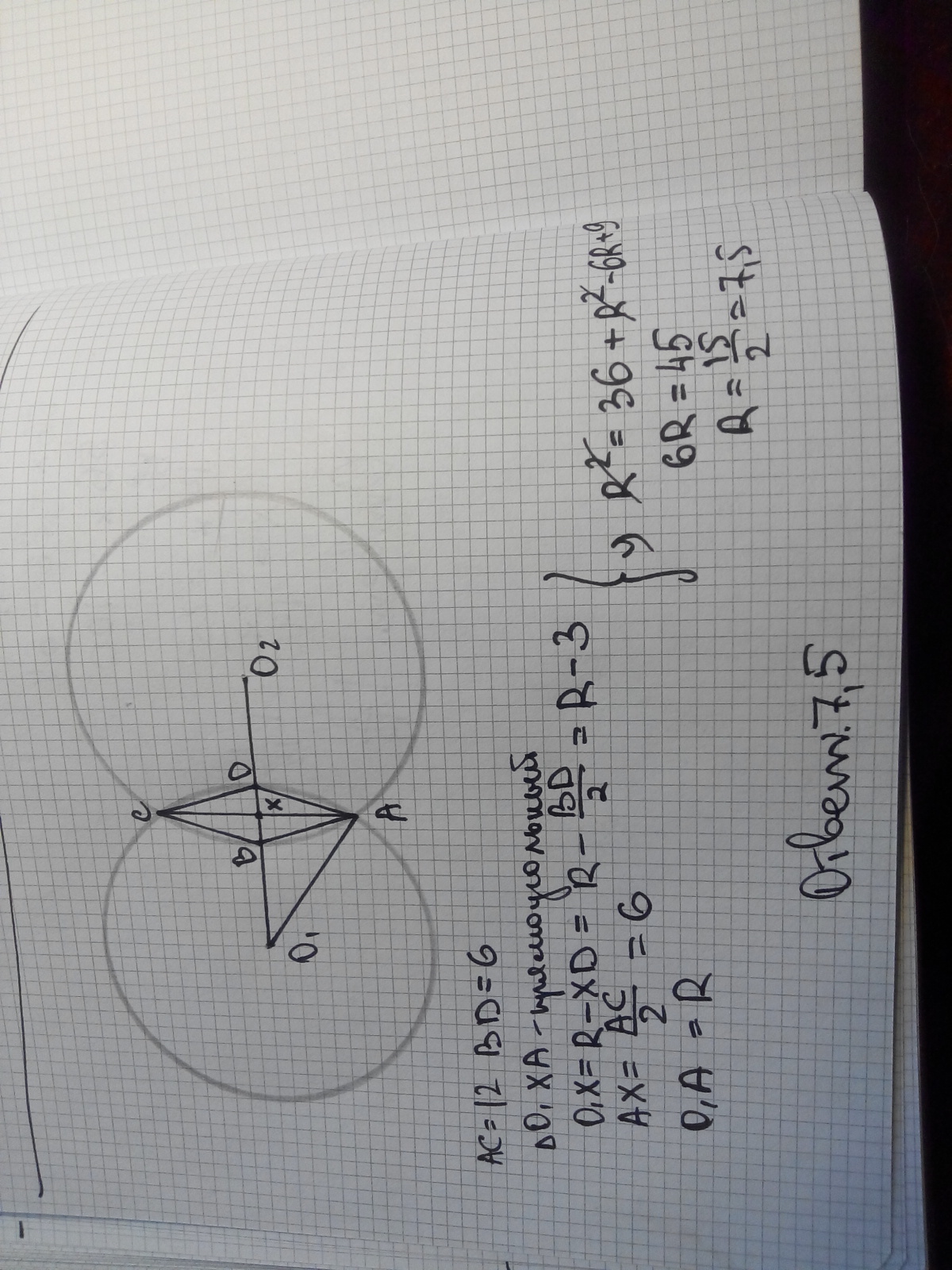 В пересечение двух равных кругов вписан ромб с диагоналями 12см и 6см. Найти радиус окружностей.