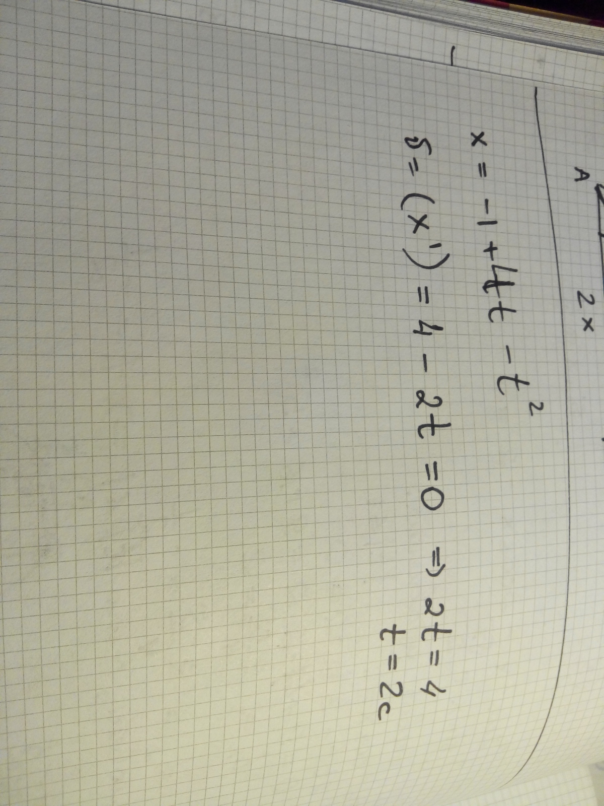 Координата точки зависит от времени по закону: x=-1+4t-t^2. Найдите момент времени, в который скорость точки обратится в нуль.