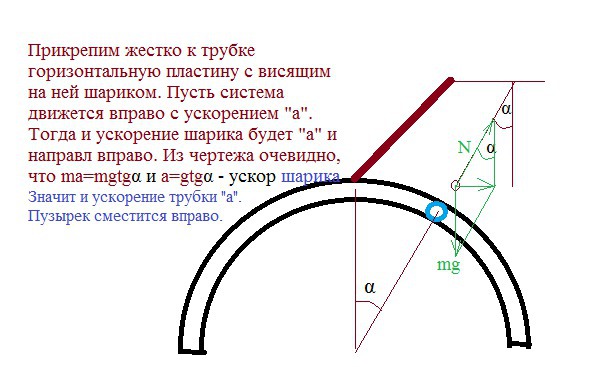Изогнутая по дуге окружности трубка заполнена жидкостью и в ней имеется пузырек воздуха (рис. 7.34). Трубка движется с горизонтальным ускорением и пузырек отклонился от вертикального положения на угол а. В какую сторону и с каким ускорением движется трубка? [вправо; Α=g*tg a]. Можно решение задачи, пожалуйста