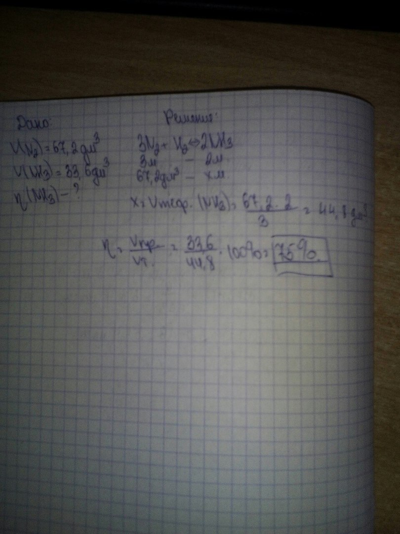 При взаимодействии 67,2 л азота с водородом образовалось 33,6 л аммиака .Узнать массовую долю (по объему) практического выхода аммиака от теоретического