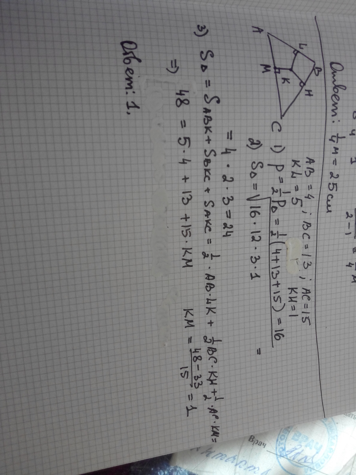 Стороны треугольника равны 4 см,13 см,15 см.Внутри его взята точка,которая находится от первой стороны на расстоянии 5 см,а от другой- на 1 см . Найдите расстояние от точки до третьей стороны.