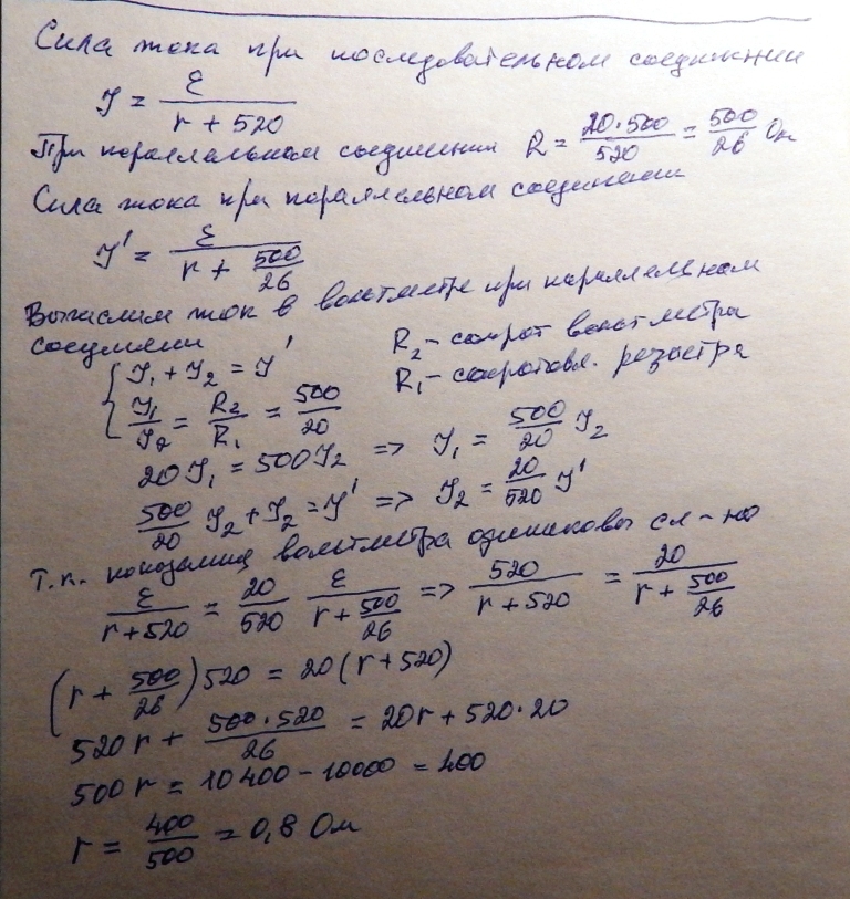 В замкнутую цепь,состоящую из аккумулятора и резистора с сопротивлением 20 Ом, подключили вольтметр,сначала последовательно,затем параллельно резистору. Показания вольтметра в обоих случаях одинаковы.Сопротивление вольтметра 500 Ом.Определить внутреннее сопротивление аккумулятора.