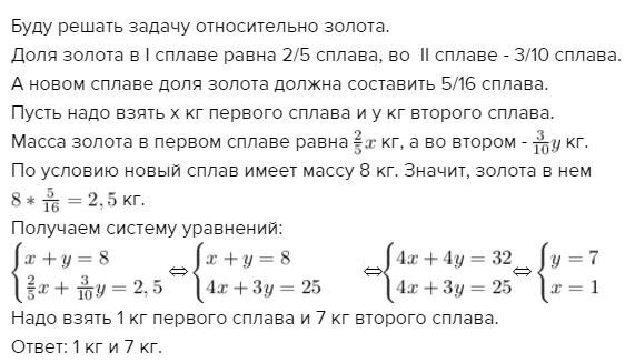 Мають два сплави золота і срібла; в одному кількість цих металів знаходиться у відношенні 2:3, в другому – у відношенні 3:7. Скільки потрібно взяти від кожного сплаву шматків, щоб отримати 8 кг нового сплаву, в якому золото і срібло були б у відношенні 5:11?