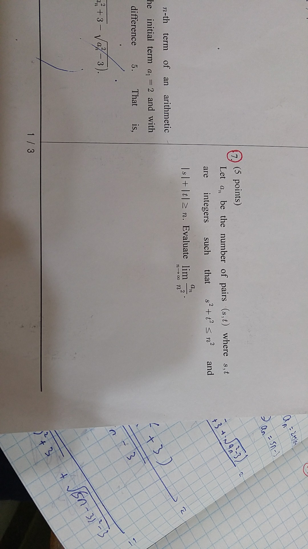 Здесь a[n] - количество точек с целыми координатами (s,t), лежащих внутри круга радиуса n и вне вписанного в этот круг квадрата со стороной n√2. Каждой такой целой точке сопоставим единичный квадрат со стороной 1, у которого, допустим, левая нижняя вершина совпадает с нашей точкой. Понятно, что количество целых точек а[n] приблизительно равно площади нашей фигуры состоящей из четырех сегментов. И ясно, что предел тогда равен (πn²-2n²)/n²=π-2.