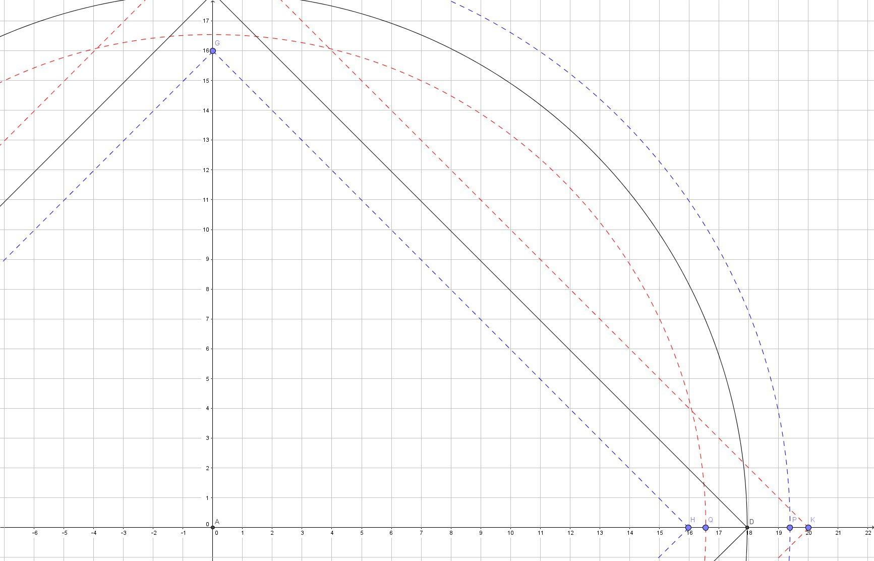 На рисунке изображено как это все выглядит. Я изобразил только один сегмент из четырех, чтобы были влезли линии сетки. Количество целых точек в черном сегменте не больше площади области между синими линиями и не меньше площади красного сегмента. Т.к. приращения площадей у синего и красного малы по сравнению с площадью черного (они пропорциональны линейным размерам фигур, т.е. пропорциональны n, а площадь черной фигуры растет как n²), то отношение a[n]/n² и отношения площадей красного сегмента и синего к n² совпадают.