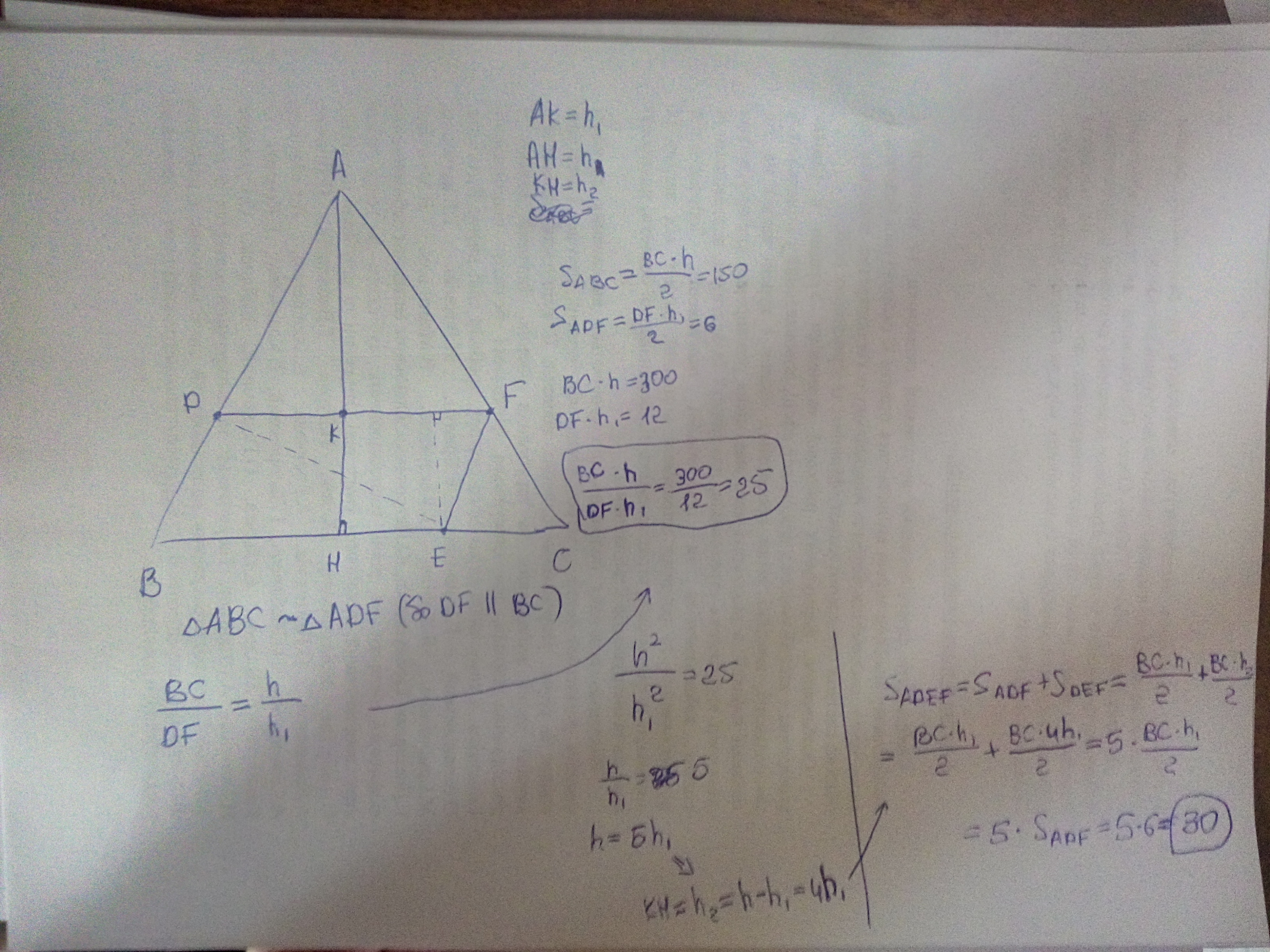 На сторонах AB, BC и CA треугольника ABC отмечены соответственно точки D, E и F так, что прямая DF параллельна стороне BC. Найдите площадь четырехугольника ADEF, если площади треугольников ABC и ADF равны 150 и 6 соответственно
