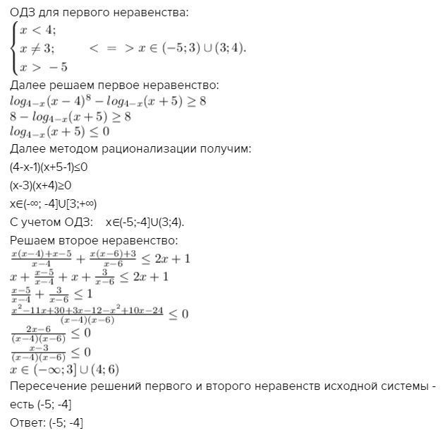 frac{2x-6}{(x-4)(x-6)} leq 0\ frac{x-3}{(x-4)(x-6)} leq 0\ x in (-infty; 3] cup (4;6)](https://tex.z-dn.net/?f=+frac%7Bx%28x-4%29%2Bx-5%7D%7Bx-4%7D+%2B+frac%7Bx%28x-6%29%2B3%7D%7Bx-6%7D++leq+2x%2B1%5C+%0Ax%2B+frac%7Bx-5%7D%7Bx-4%7D+%2B+x%2Bfrac%7B3%7D%7Bx-6%7D++leq+2x%2B1%5C%0Afrac%7Bx-5%7D%7Bx-4%7D+%2Bfrac%7B3%7D%7Bx-6%7D++leq+1%5C%0A+frac%7Bx%5E2-11x%2B30%2B3x-12-x%5E2%2B10x-24%7D%7B%28x-4%29%28x-6%29%7D++leq+0%5C+%0A+frac%7B2x-6%7D%7B%28x-4%29%28x-6%29%7D++leq+0%5C++frac%7Bx-3%7D%7B%28x-4%29%28x-6%29%7D++leq+0%5C+x+in+%28-infty%3B+3%5D+cup+%284%3B6%29)