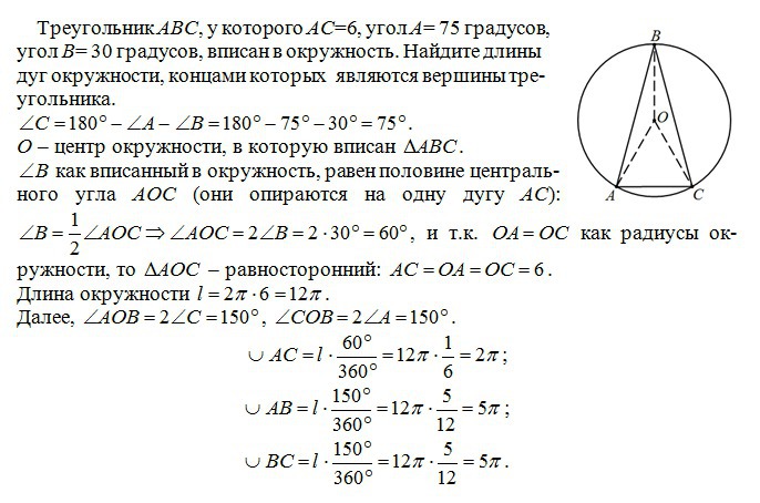 треугольник АВС, у которого АС=6, угол А= 75 градусов , угол В= 30 градусов, вписан в окружность. Найдите длины дуг окружности, концами которых
