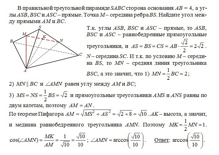 Помогите, пожалуйста. В правильной треугольной пирамиде SABC сторона основания AB = 4, а углы ASB, BSC и ASC-прямые. Точка M- середина ребра BS. Найдите угол между прямыми AM и BC.