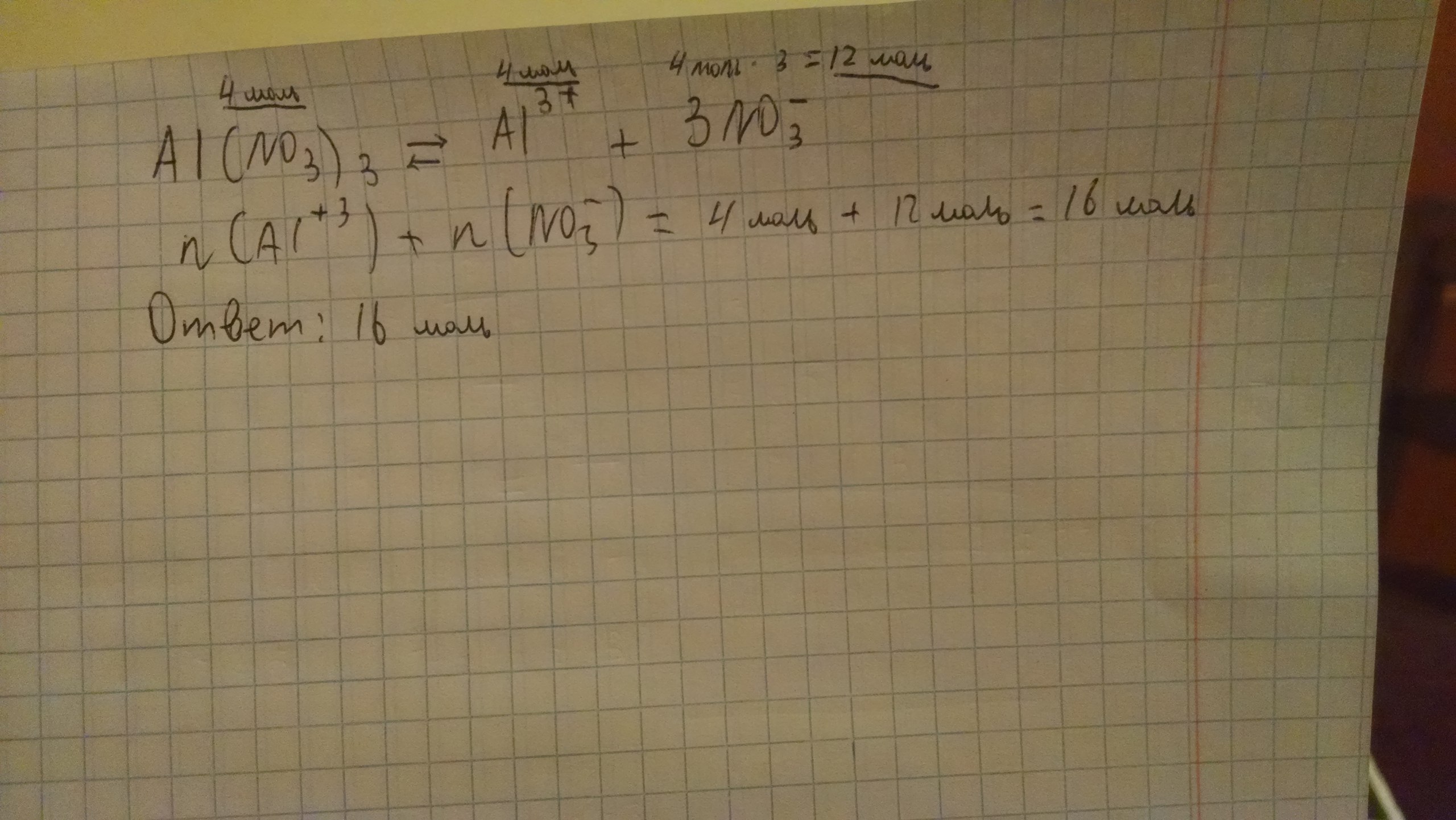 Алюміній нітрат,кількість речовини якого становить 4 моль, розчинили у воді.Укажіть сумарну кількість речовини позитивно і негативно заряджених йонів.Яка сумарна кількість речовини позитивно і негативно заряджених йонів в утвореному розчині?
