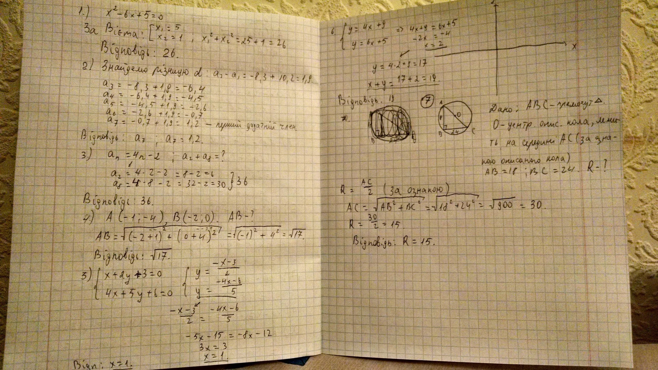 7.Катети прямокутного трикутника 18 і 24. Обчислити радіус описаного кола.