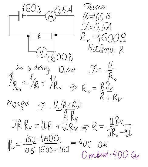 К источнику тока подключен амперметр и резистор параллельно резистору вольтметр. Показания амперметра 0,5 А, вольтметра 160 В. Определите сопротивление резистора, если сопротивление вольтметра 1600 Ом.