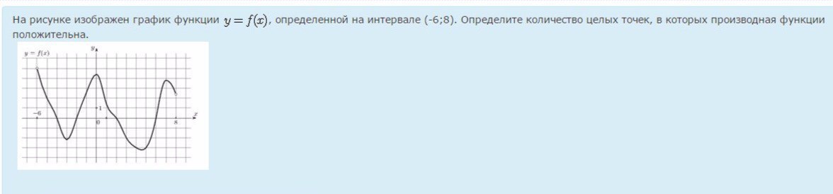 На рисунке изображен график функции y = f(x) , определенной на интервале (-6;8). Определите количество целых точек, в которых производная функции положительна.