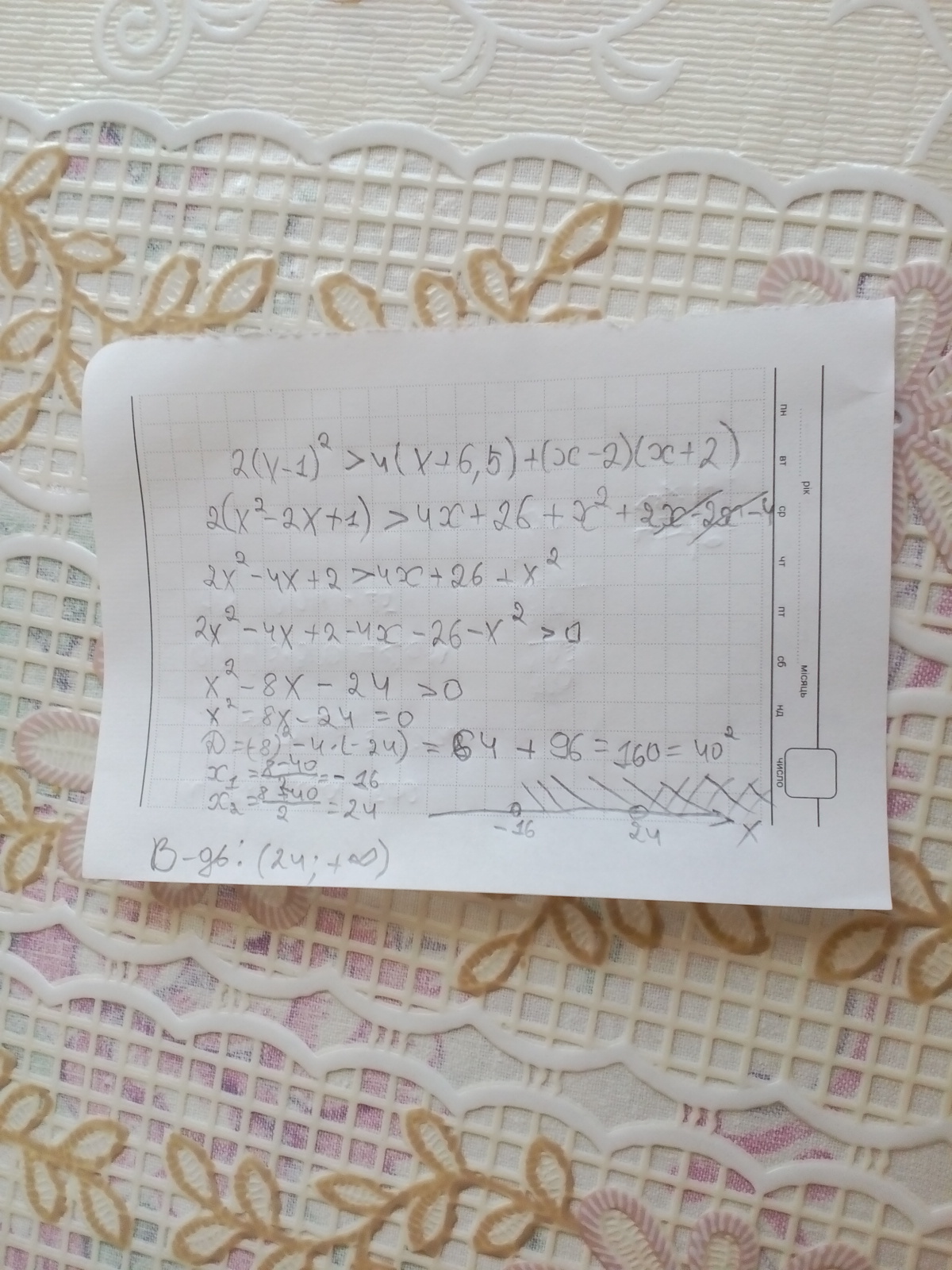 Розв’язати нерівність: 2(x-1)до квадрату >4(x+6.5)+(x-2)(x+2) Поможіть будь ласка дуже треба срочноо