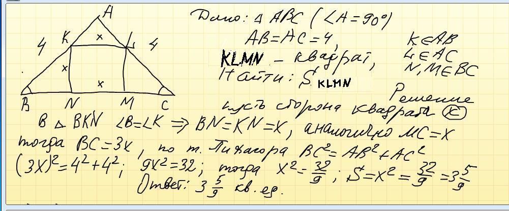 В равнобедренный прямоугольный треугольник с катетами по 4 см вписан квадрат. Найти площадь квадрата.