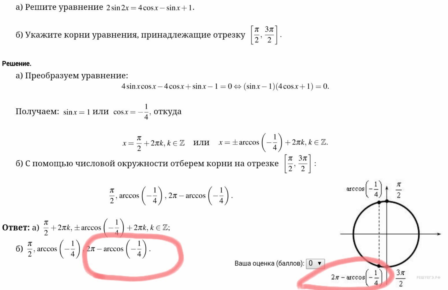 Это следует хотя бы из вашего рисунка. Прямая, параллельная оси ОУ, пересекает окружность в двух точках, которые обе принадлежат интервалу [π/2; 3*π/2]. А из рисунка видно, что "второму" углу x2"не хватает" до угла 2*π как раз "первого" угла, т.е. того самого x1=arccos(-1/4). Отсюда и x2=2*π-arccos(-1/4).