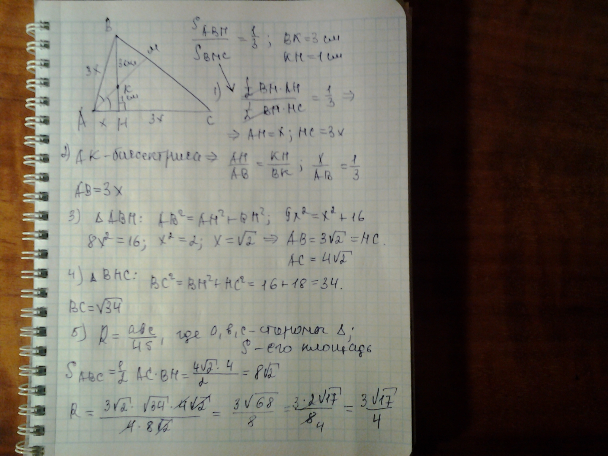 высота делит площадь треугольника в отношении 1:3,биссектриса треугольника делит эту высоту на отрезки 3 см и 1 см . найти радиус описанной около треугольника окружности