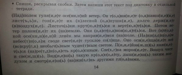 Над полем гуляет осенний ветер. Он гоняет опавшие листья, гонит их к лесной опушке, долго держит в воздухе. Листочки крутятся и вертятся. Потом ветер положит их на землю, и они остановятся. Вот в такой осенний денёк мы выходим из дома. Мы направимся на поле. На низком небесном своде светит тусклое солнце. Оно освещает всё вокруг необычным чудесным светом. Пейзаж кажется на редкость красивым. Слегка морозит. Воздух чист и свеж. Когда видишь такую красоту и дышишь таким воздухом, то на душе становится радостно.