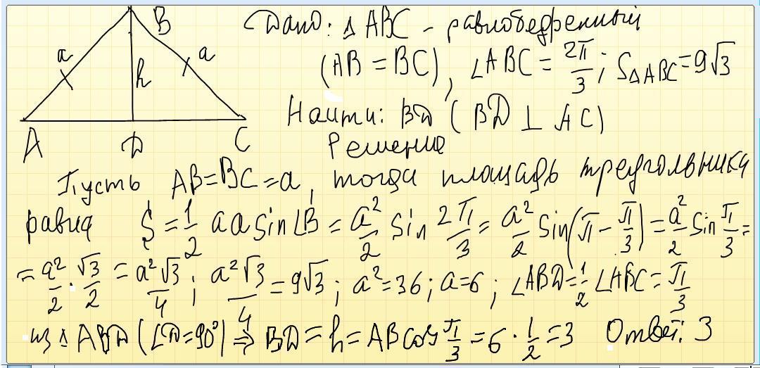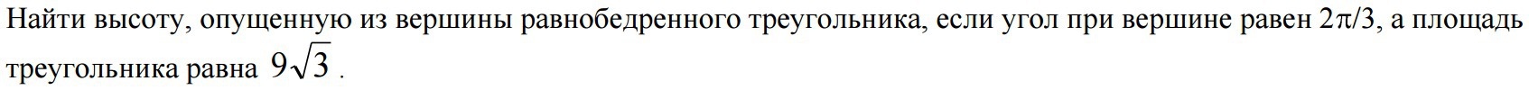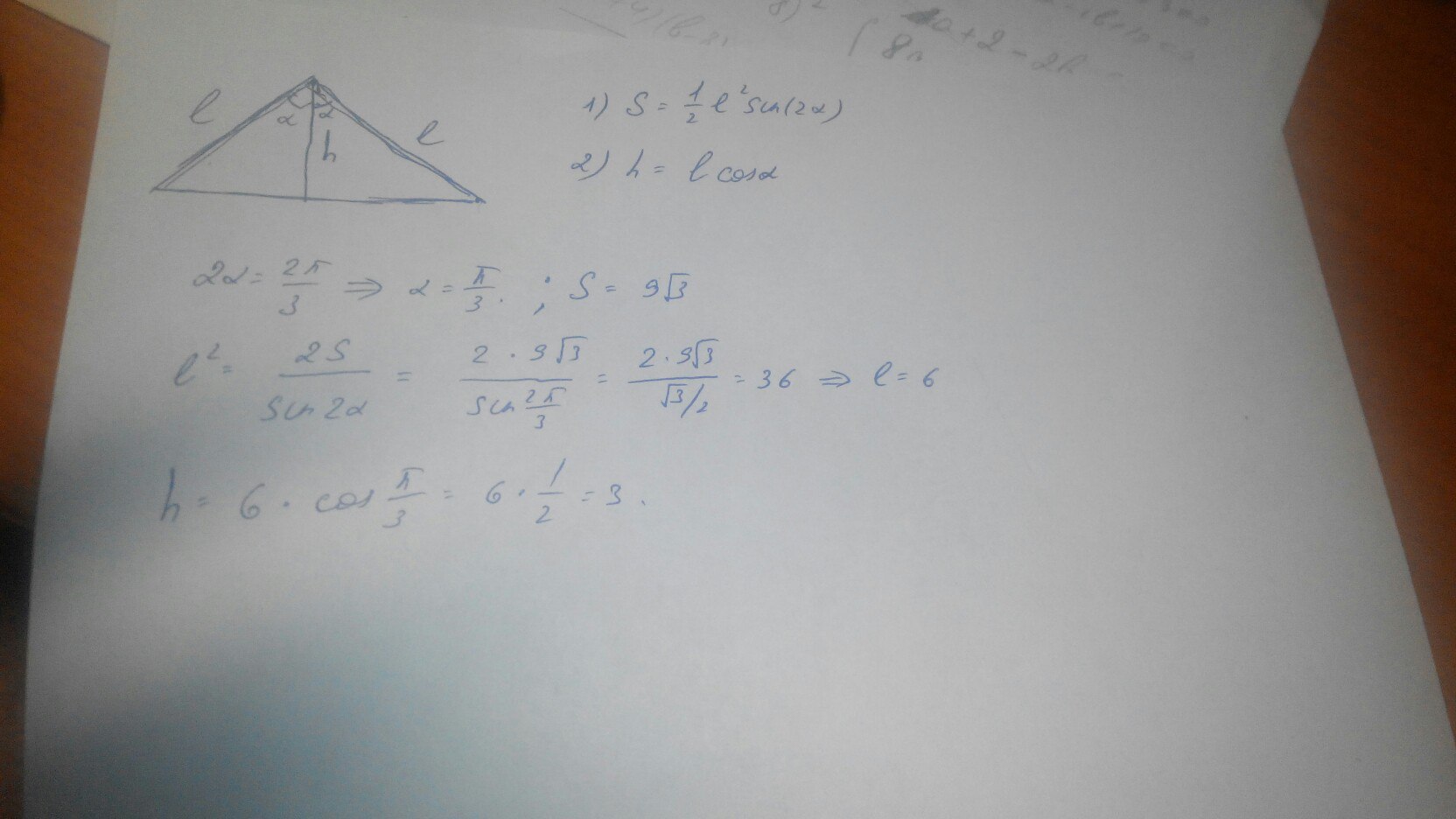 Найти высоту, опущенную из вершины равнобедренного треугольника, если угол при вершине равен 2п/3, а площадь треугольника равна 9корень3