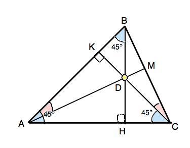 В ∆ АВН два угла при АВ равны 45°⇒∠ВНА=90° и ∆ АВН - равнобедренный прямоугольный, Тогда точка D - пересечение высот СК и ВН треугольника АВС. Отрезок АМ, содержащий АD, проходит через точку пересечения высот, следовательно, является высотой и перпендикулярен ВС. Отсюда АD⊥ВС. Доказано.