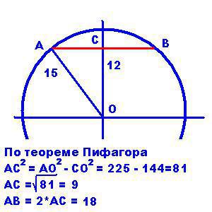 Знайдіть довжину хорди, що проведена в колі радіуса 15 см на відстані 12 см від центра кола. Объясните по-подробнее