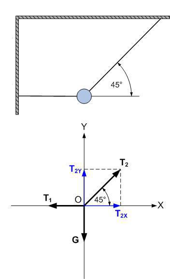 Само тело заменяем материальной точкой О и помещаем в нее начало координат. Направления осей выбираем так, чтобы на эти оси ложилось максимально возможное количество сил. А сил у нас всего три - две, ранее уже упомянутые силы натяжения нитей и вес тела G. Для того, чтобы тело находилось в равновесии, равнодействующая всех действующих на него сил равна нулю. Представим силу натяжения нити T₂ в виде разложения по осям Х и Y (на схеме изображено синим).