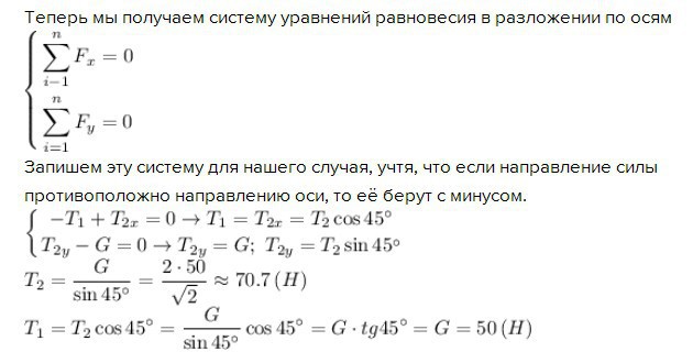 Получаем силы натяжения 50Н и 70.7Н