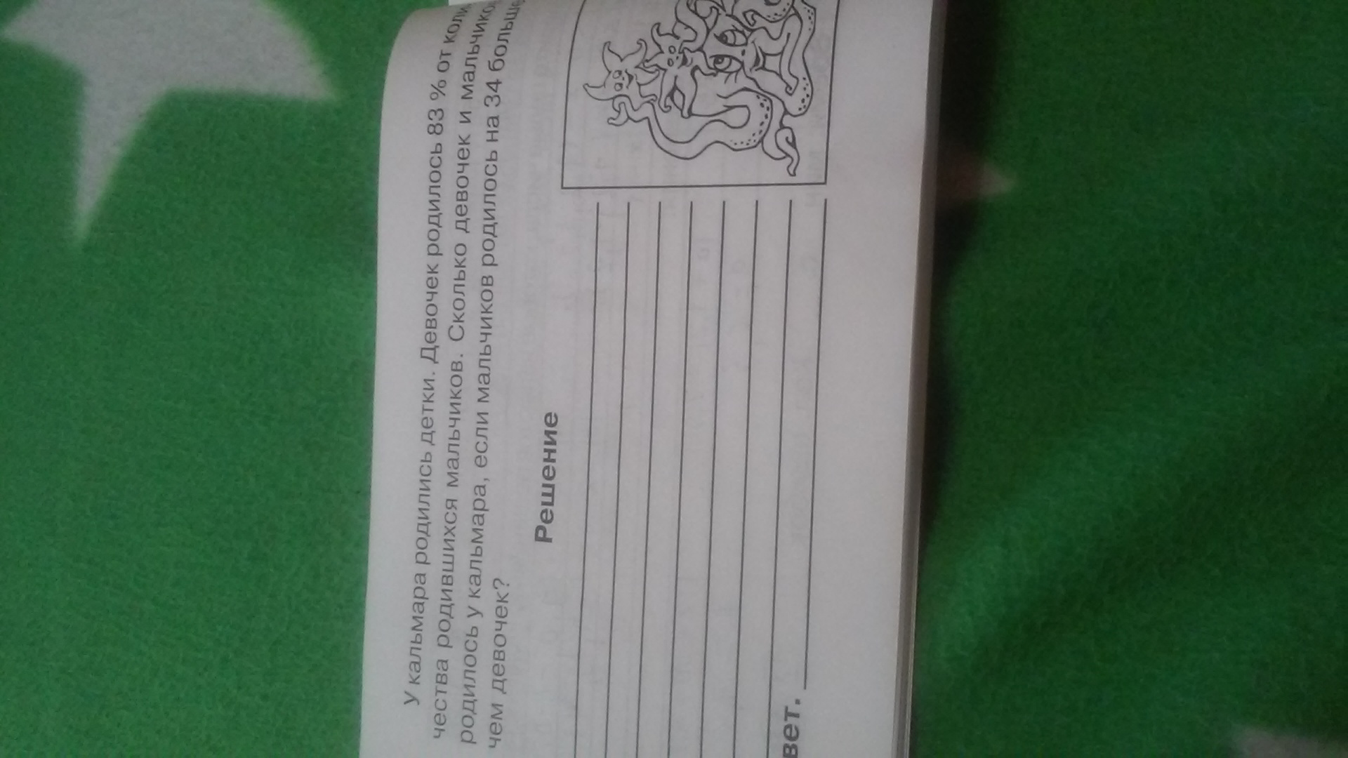 Нужна пропорция:17%-34(мальчики)и 83%-x(девочки).Решается крест на крест,то есть 83% умнажаем на 34 и делим на 17%,выходит 166(девах).Сумма 200(деток).