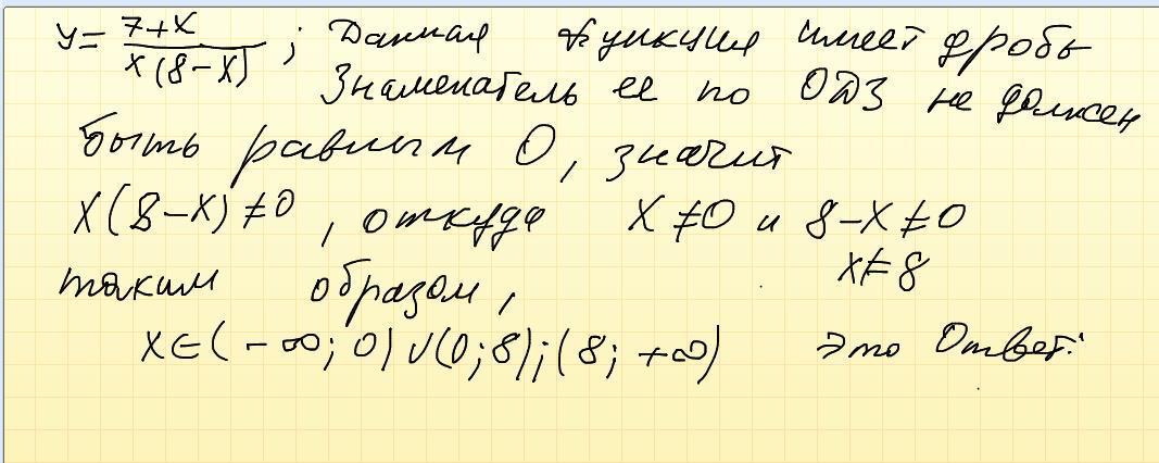 x=7;x=/0;x=/8.(=/-не равно)<br /><br />D(y)=(-¤¤;0)^(0;8)^(8;+¤¤) <br />(¤¤ - бесконечность;<br />^ - обединение)