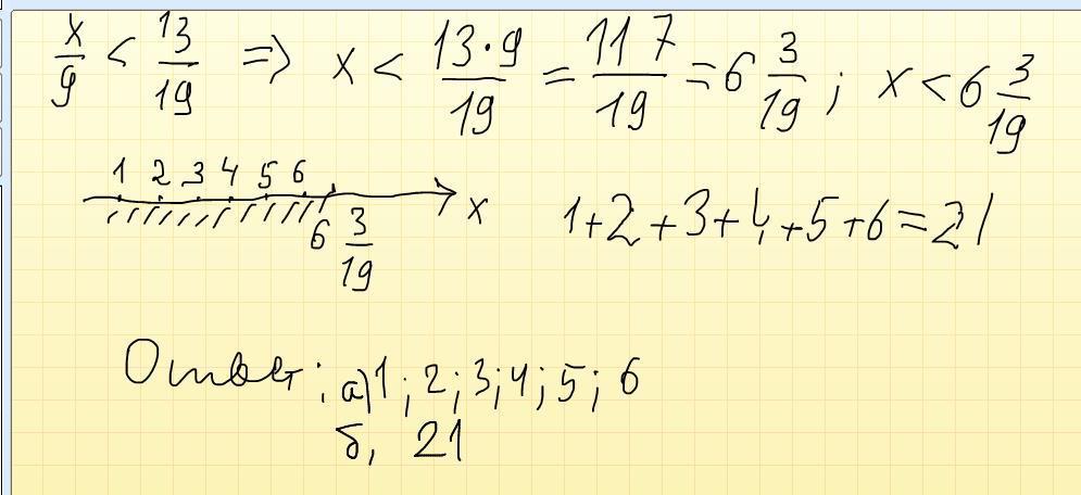 Найдите все такие натуральные числа, при подстановке которых вместо х верно неравенство (х/9) < (13/19). Сложите эти числа