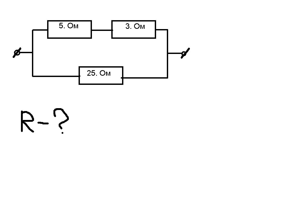 3 и 5 ом соединены последовательно поэтому R= R1+R2=8 тогда 8 ом и 25 ом соединены параллельно а значит по формуле R=R1*R2/(R1+R2)=6.06 ом