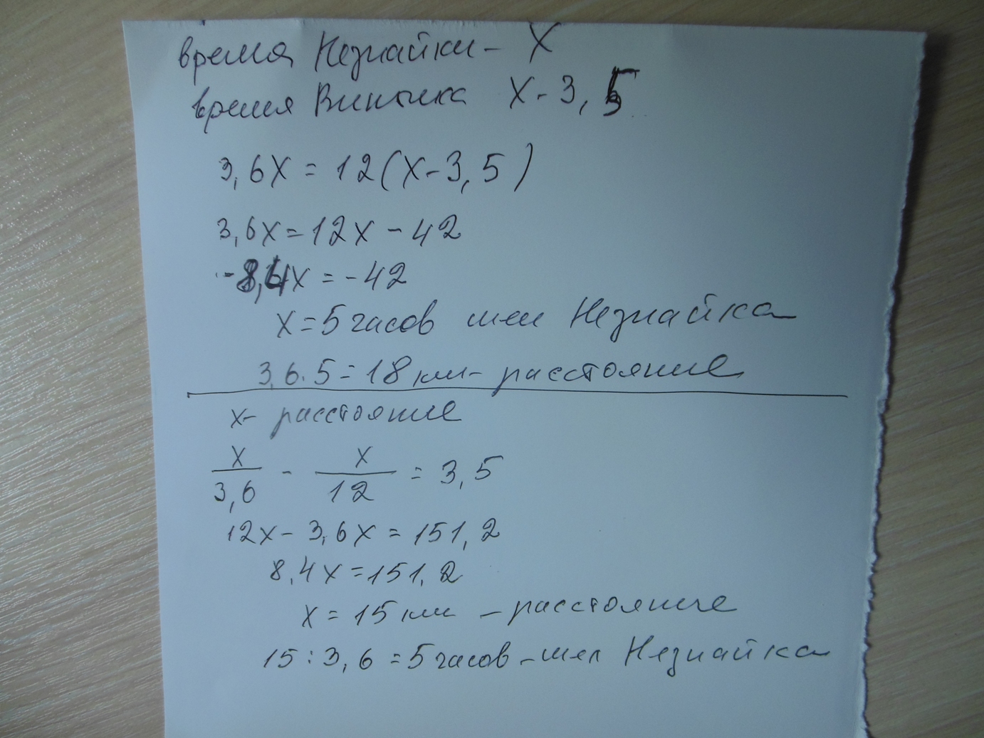 в 9:00 утра Незнайка вышел из цветочного города в Солнечный со скоростью 3,6 километров в час в 12 часов 30 минут следом за ним на вездеходе собственной конструкции выехали Винтик и Шпунтик. Вездеход двигался со скоростью 12 километров в час и прибыл в Солнечный город одновременно с Незнайкой. Сколько времени шел Незнайка? Каково расстояние между Цветочным и Солнечным городами?(помогите решить разными уравнениями)