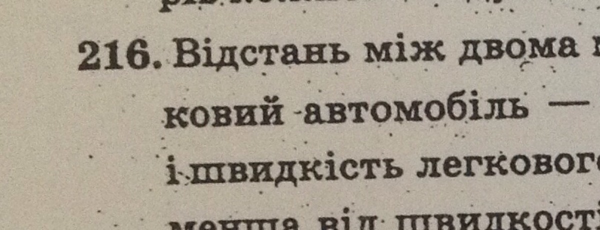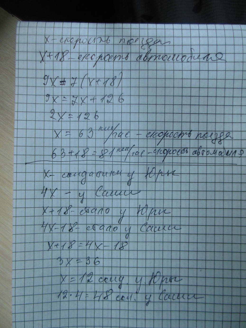 216. Расстояние между двумя городами поезд преодолел за 9 ч, а легковой автомобиль за 7 часов. Найдите скорость поезда и скорость легкового автомобиля, если скорость поезда меньше скорости легкового автомобиля на 18 км / ч, а расстояния между городами железной дорогой и по шоссе одинаковы.