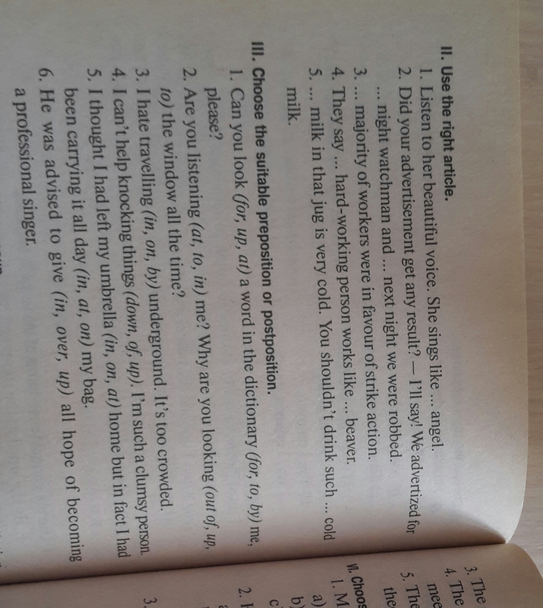 III. 1. up, for; 2. to, out of; 3. by; 4. down; 5. at, in; 6. up