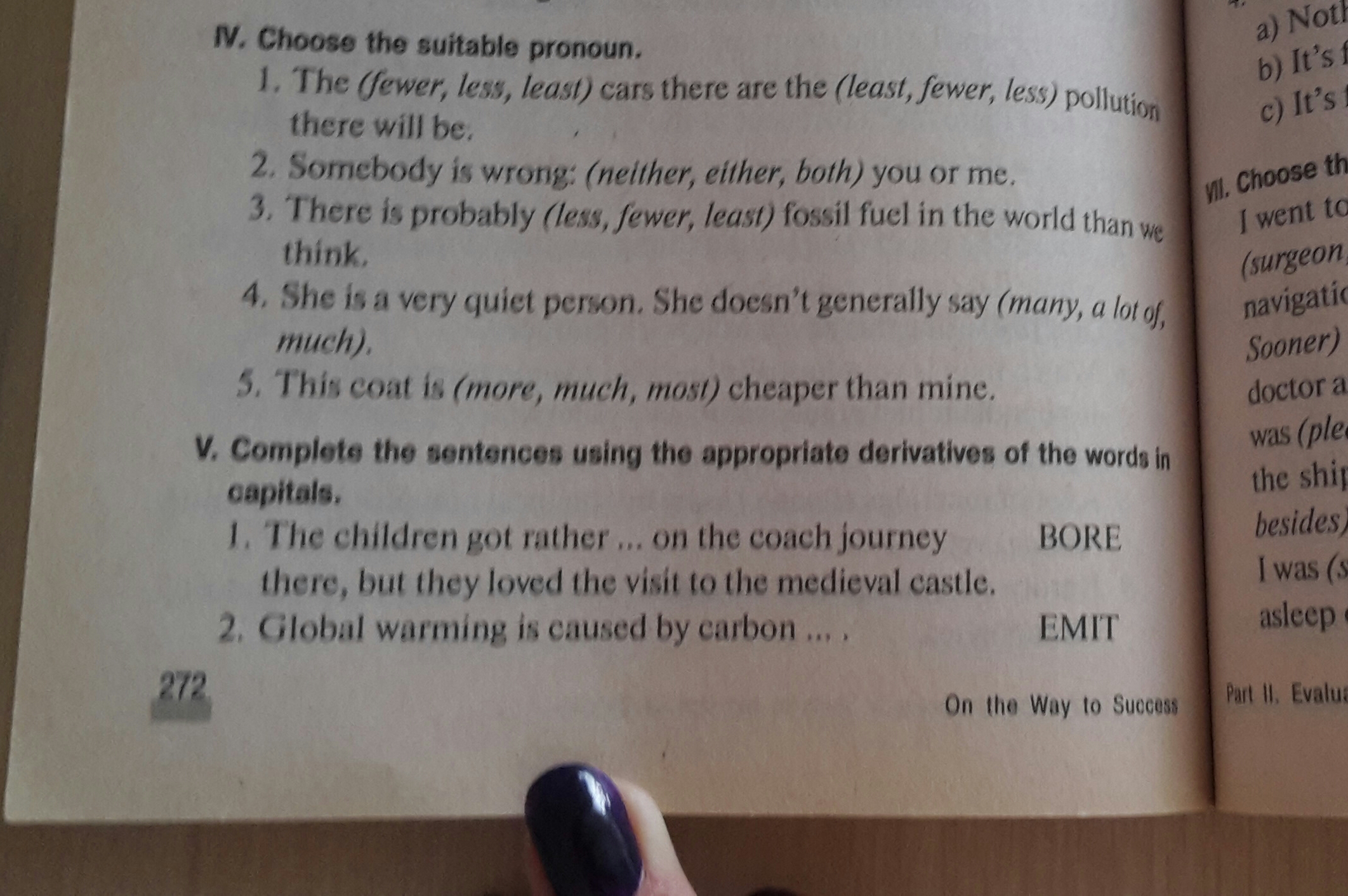 IV. 1. fewer, less; 2. either; 3. less; 4. much; 5. much