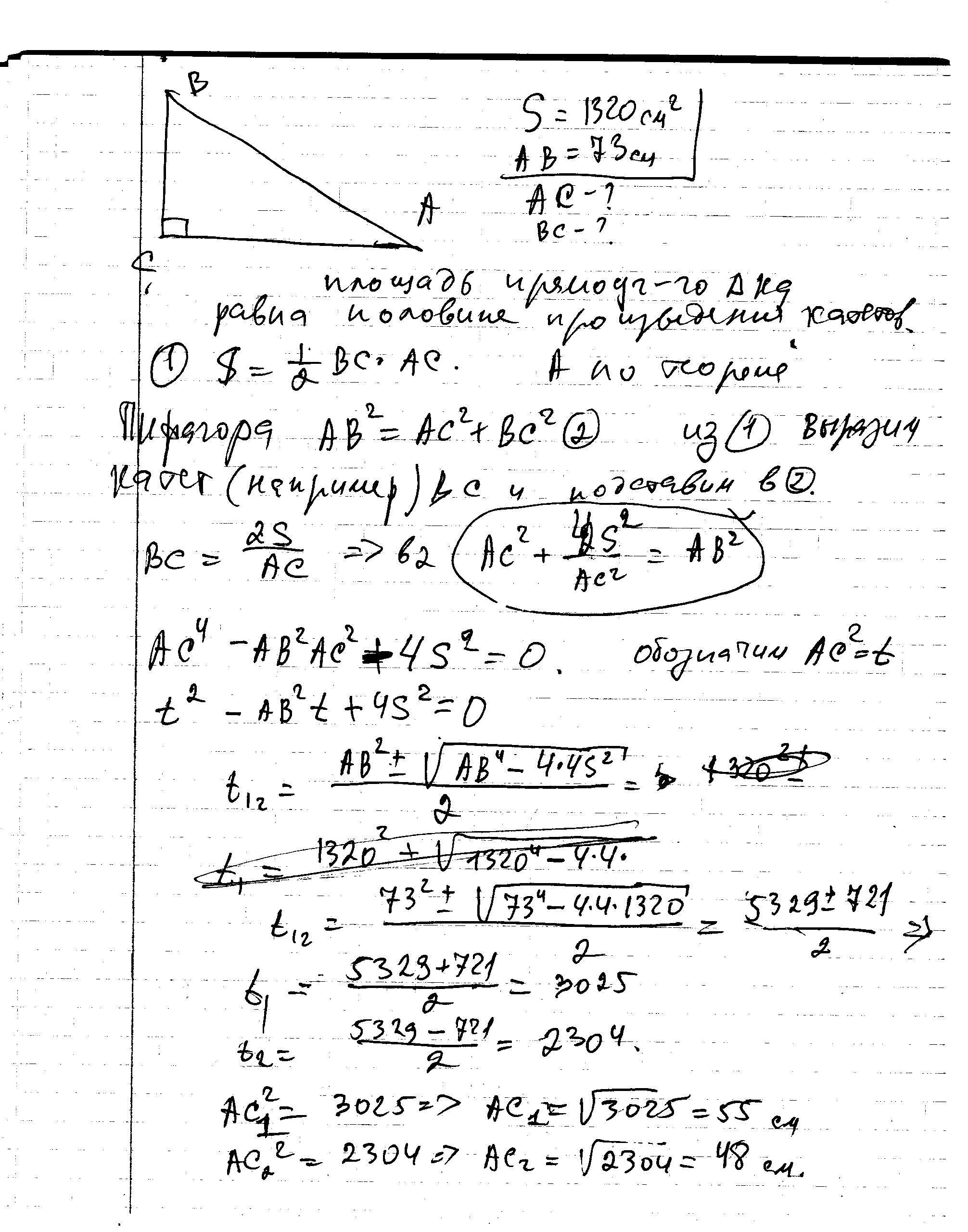 чому дорівнюють катети прямокутного трикутника,якщо його гіпотенуза дорівнює 73 см,а площа дорівнює 1320 см2