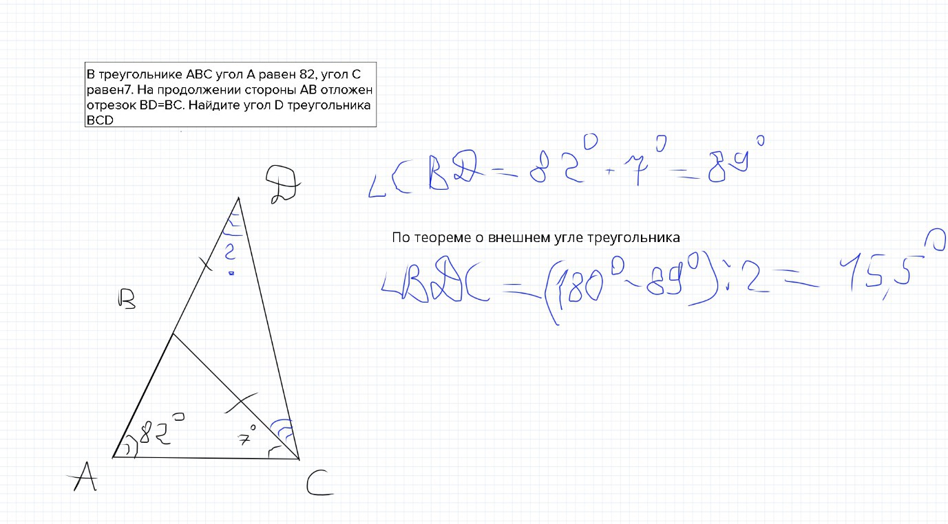В треугольнике ABC угол A равен 82, угол C равен7. На продолжении стороны AB отложен отрезок ВD=BC. Найдите угол D треугольника BCD