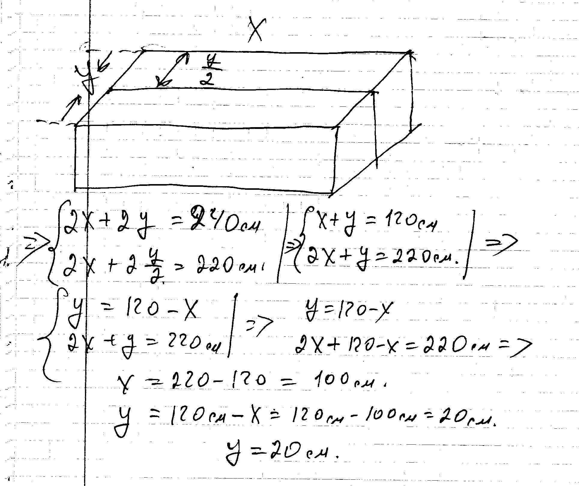 На уроці трудового навчання потрібно було дерев'яну заготовку прямокутної форми розпиляти на дві однакові дощечки вздовж більшої сторони.Учень,який виконував це завдання,помітив ,що периметр заготовки дорівнює 240см,а периметр кожної з отриманих з неї дощечок-220см.Знайдіть довжину меншої сторони заготовки.