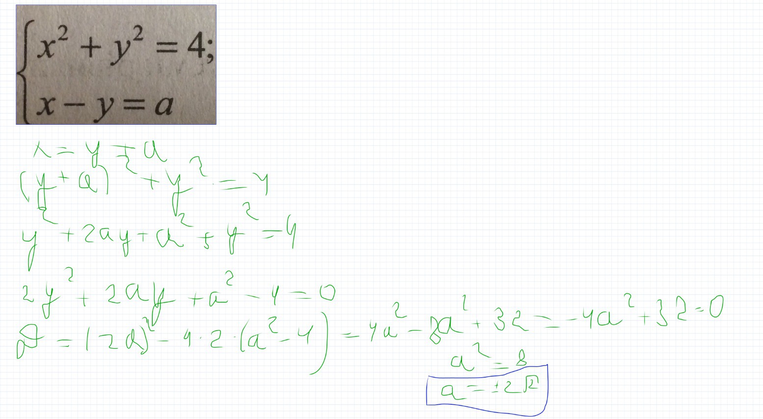 y^2+(y+a)^2=4 2y^2+2(yа)+a^2-4=0 D=4a^2-4*2*(a^2-4)=4*(8-a^2) D=0 при 8=a^2