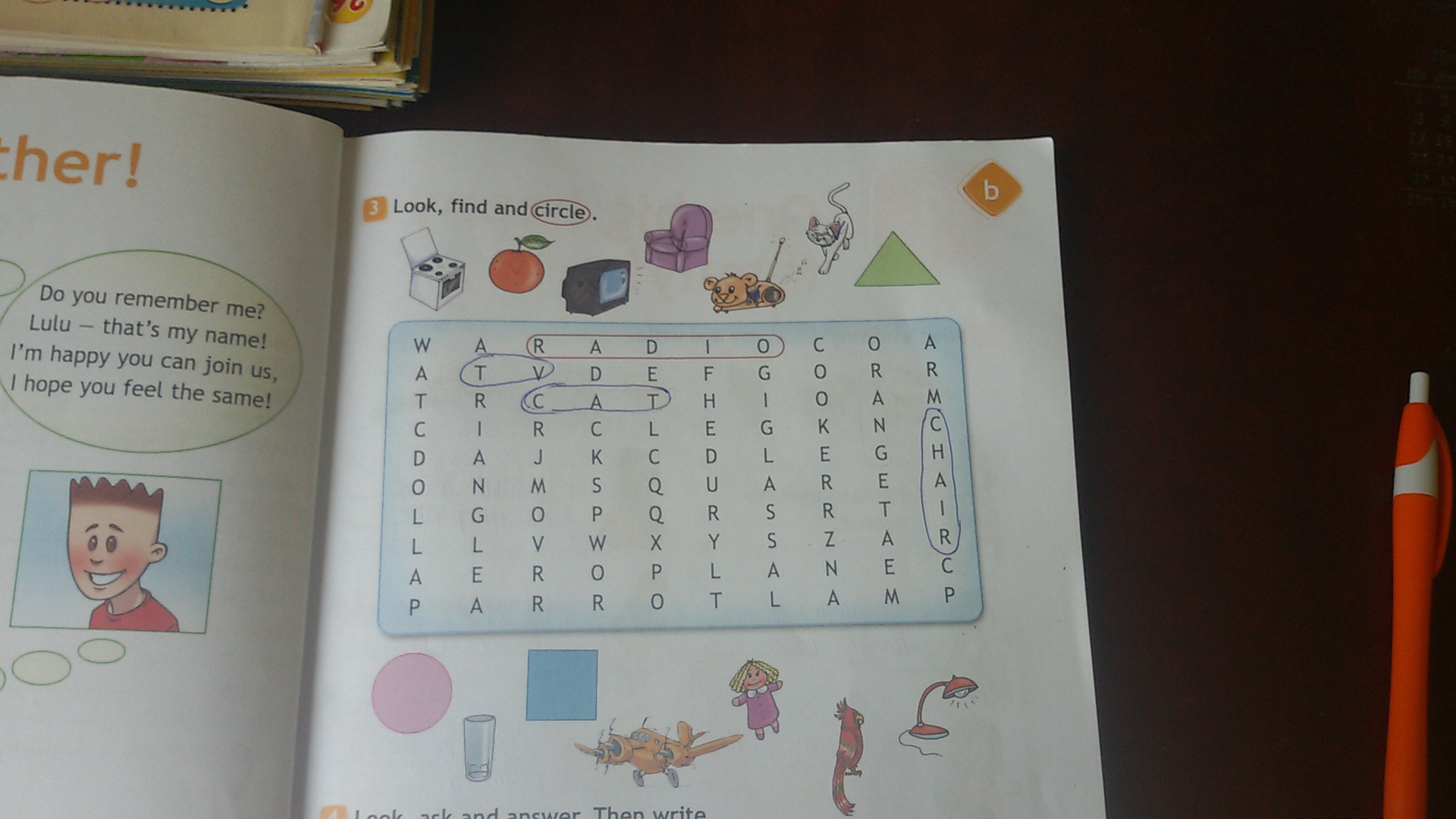 cooker, apple, TV, armchair, radio, triangle, cat, circle, glass, square, airplane, doll, lamp, parrot