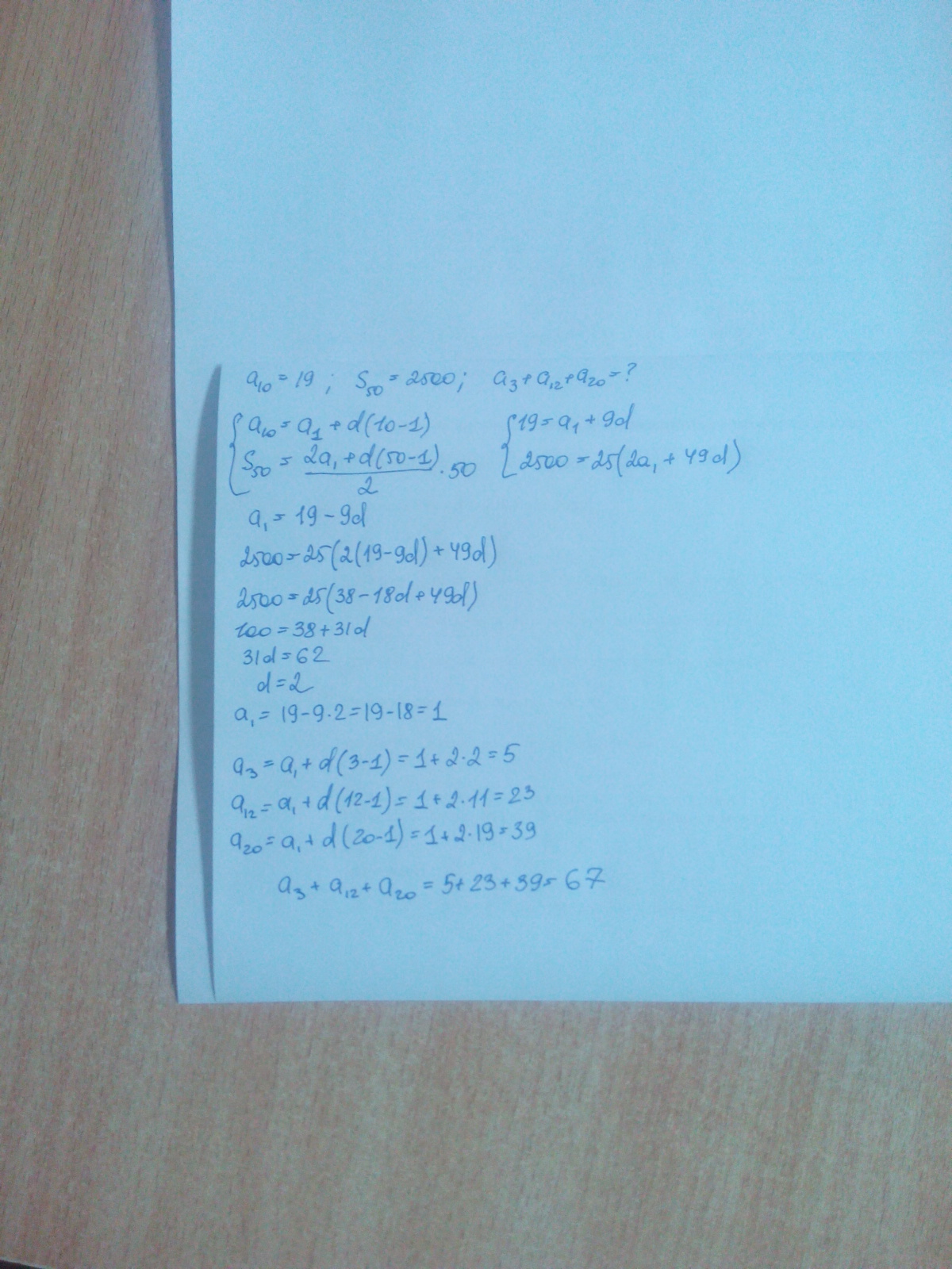 Десятый член арифметическо1 прогрессии равен 19, а сумма первых 50 членов равна 2500.найдите сумму третьего,двенадцатого, и двадцатого членов прогресии