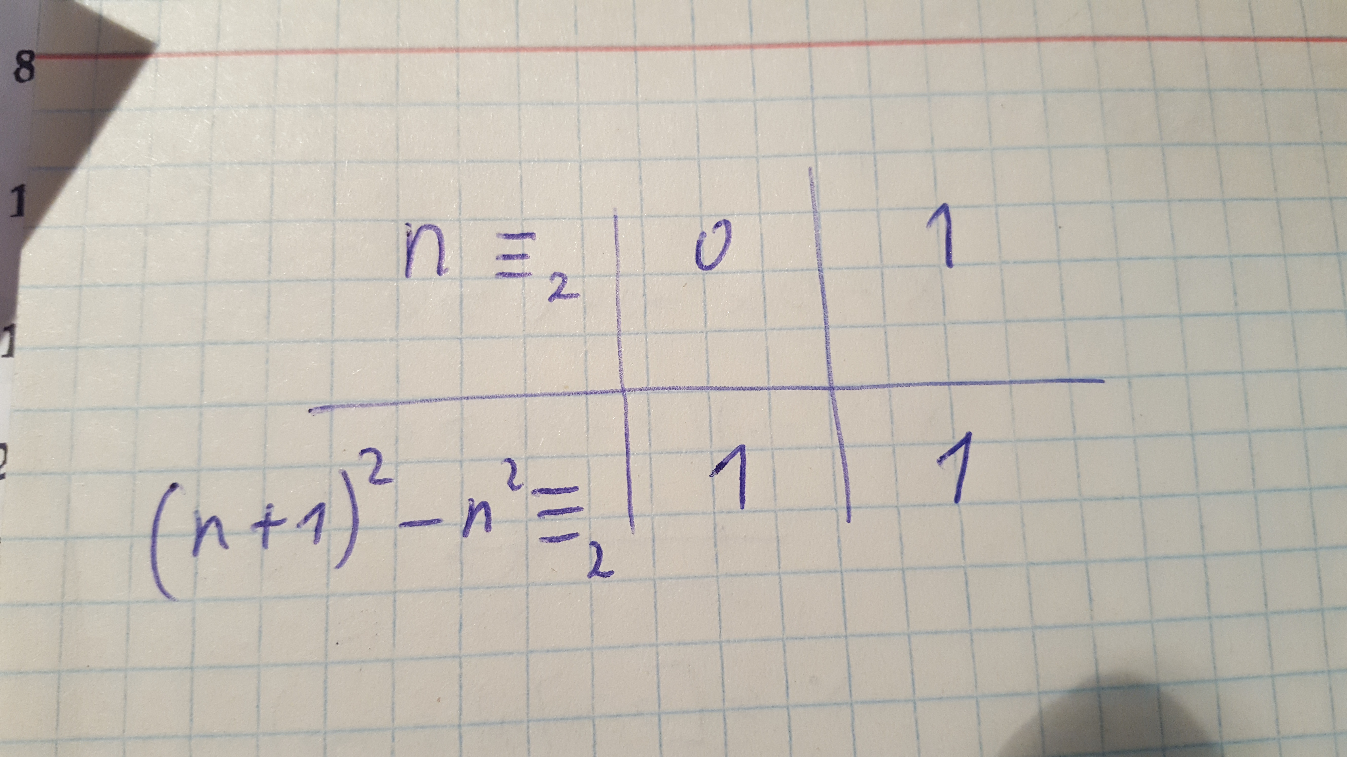 А дальше просто подставляем эти остатки 0 и 1 вместо n в выражение (n + 1)² - n² и получаем, что это выражение сравнимо по модулю 2 только с 1, что значит, что это число НЕ делится на 2 (если б делилось на 2, то оно было бы сравнимо по модулю 2 с нулем)
