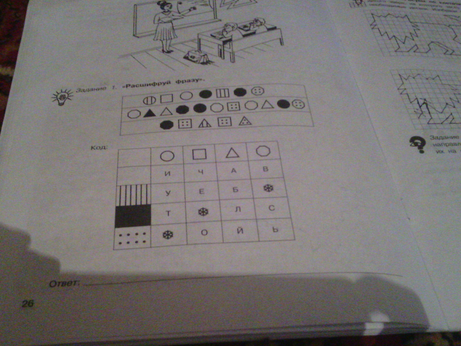 Чтобы расшифровать фразу, надо внимательно посмотреть на фигуру и рисунок внутри неё. Потом ищем в таблице по горизонтали саму фигуру, а по вертикали рисунок, и совмещаем их.