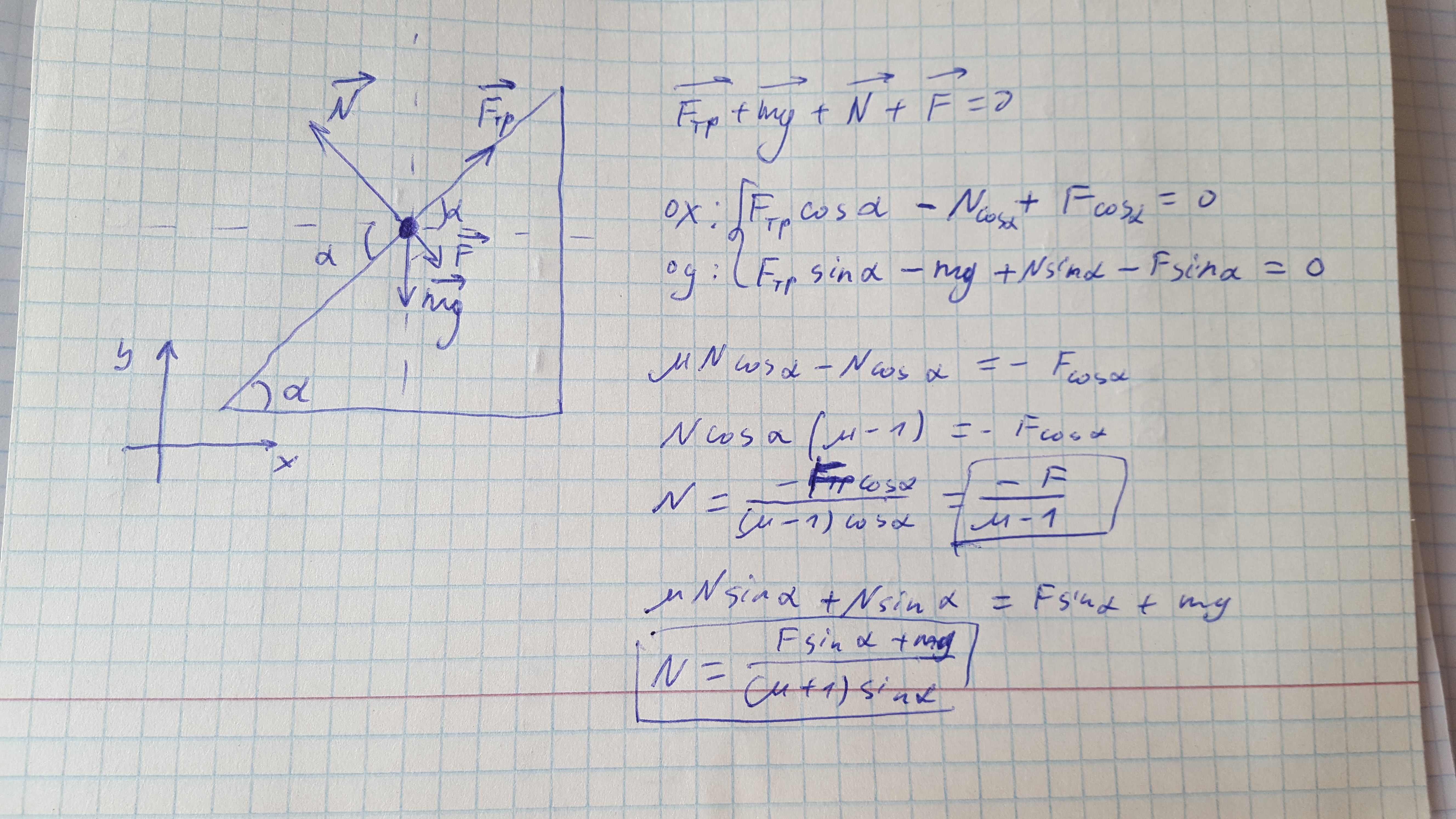На рисунке показано, чему равна нормальная реакция опоры N.
