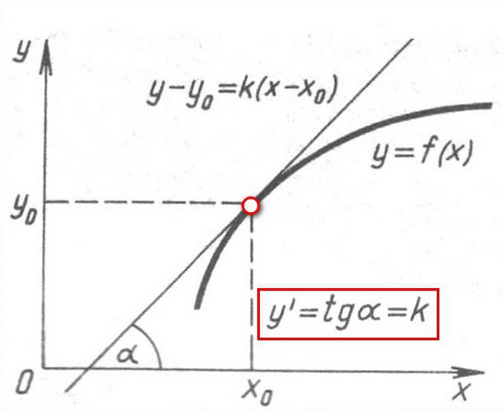 Геометрический смысл производной функции y=f(x) в некоторой точке x - это тангенс угла наклона касательной, проведенной к графику функции в некоторой точке A(x,y).